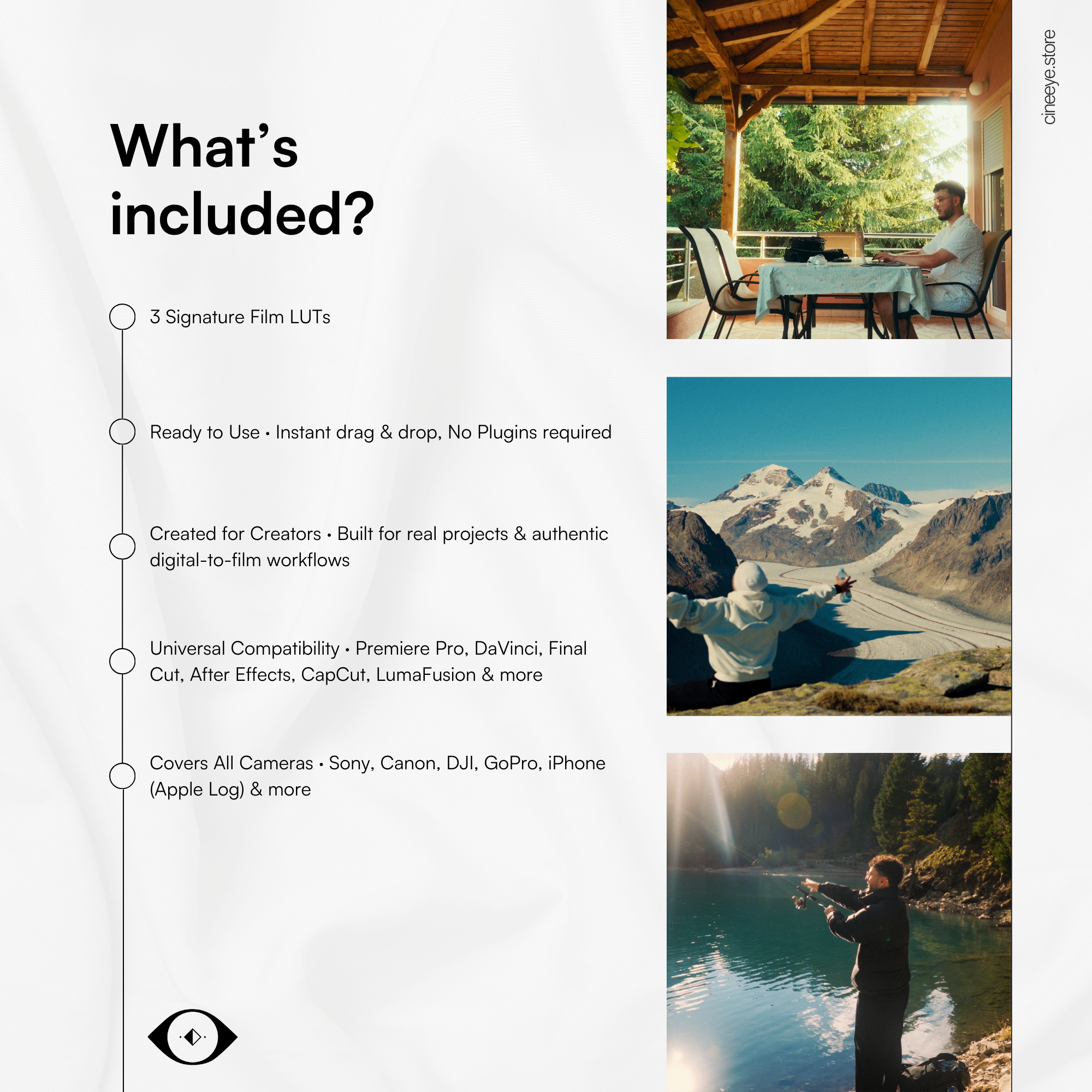 With 3 signature LUTs, the Timeless Film LUTs gives your content authentic film character - elegant, cinematic and built to stand the test of time.